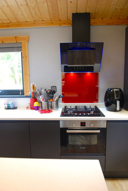 An on-trend dark grey kitchen with all the latest appliances has pride of place in Dave’s new home. The cabin also includes two bedrooms, small utility room, entrance hall and living area. Underfloor heating keeps the annex cosy. Finished in a contemporary grey hue outside, the annex sits at the edge of the large lawn, next to Kelly’s chickens and vegetable patch. Decking wraps around the annex with a private terrace at the back, with views over the neighbouring fields.