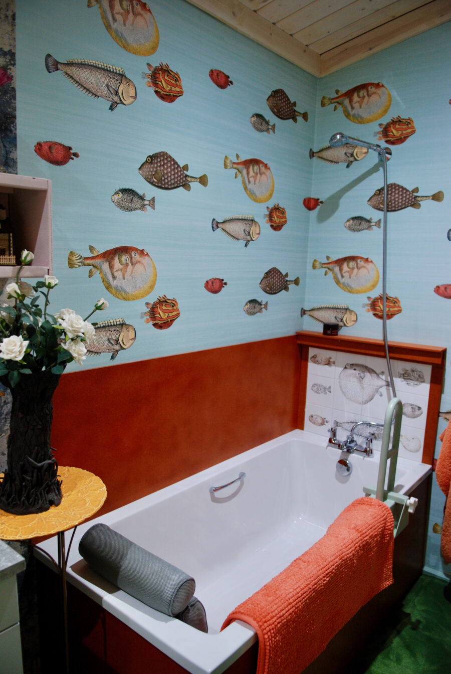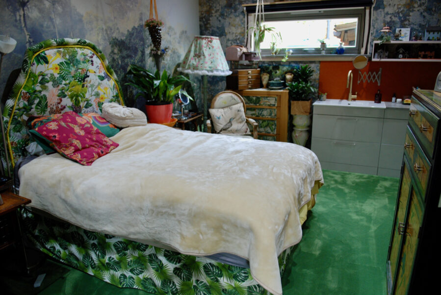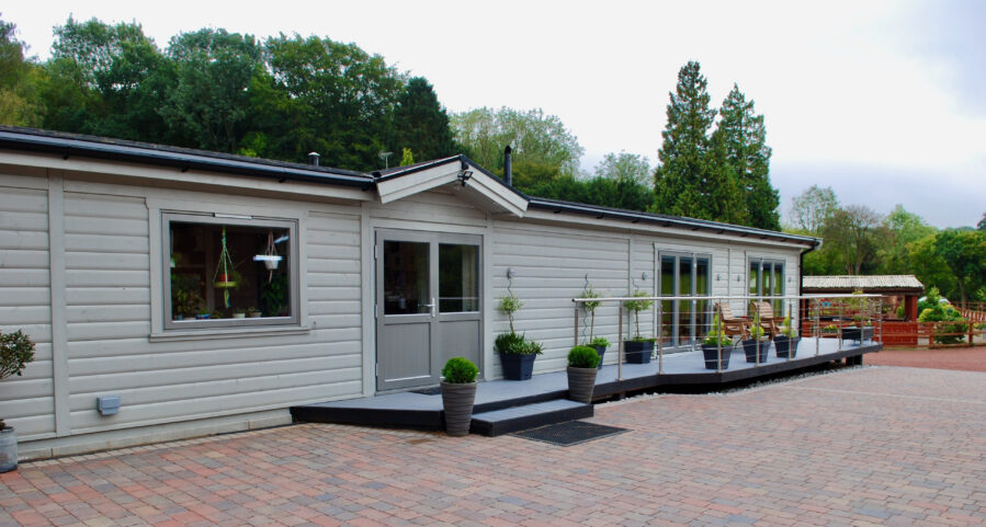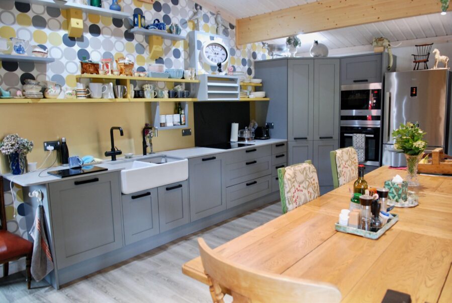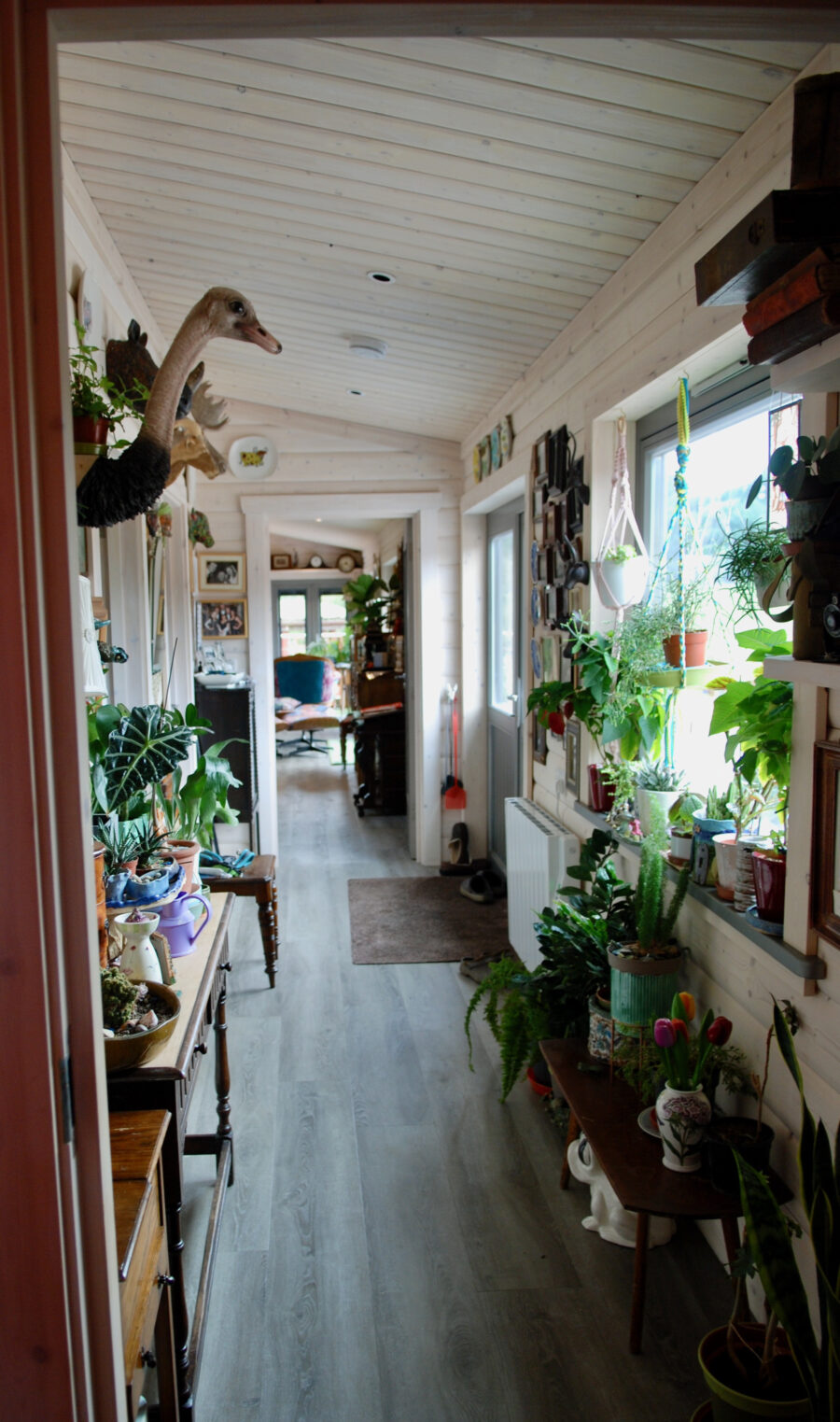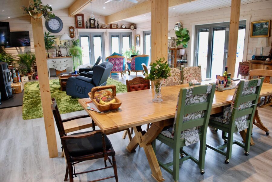 The log home has been designed bespoke to the couple’s exact needs. It boasts two double bedrooms with open plan en-suite bathrooms, a utility/boot room, hallway, and large kitchen and sitting room. The couple downsized from a traditional period property and their belongings have been carefully positioned to make the cabin feel homely and stylish, whilst Sue’s enviable houseplant collection gives an on-trend vibe to the living spaces.