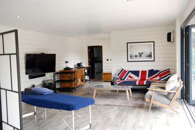 Gym equipment sits behind a stylish room divider at the far end of the room, with a massage treatment table next to that. At the other end, comfortable seating and a large TV invite you to snuggle up and watch your favourite box set.