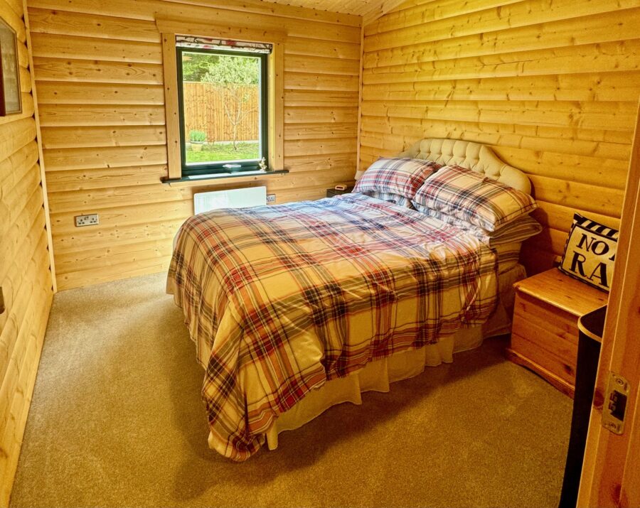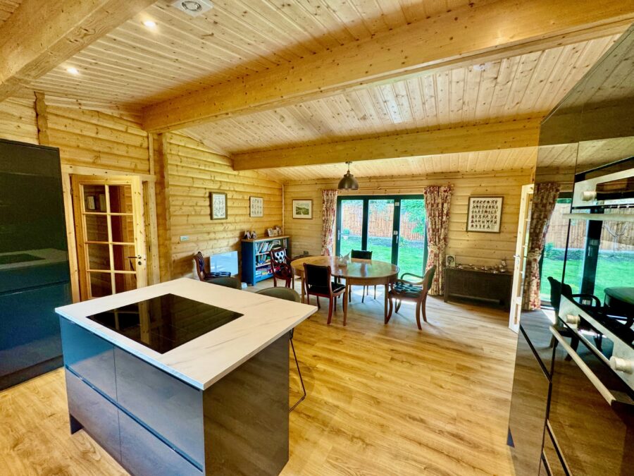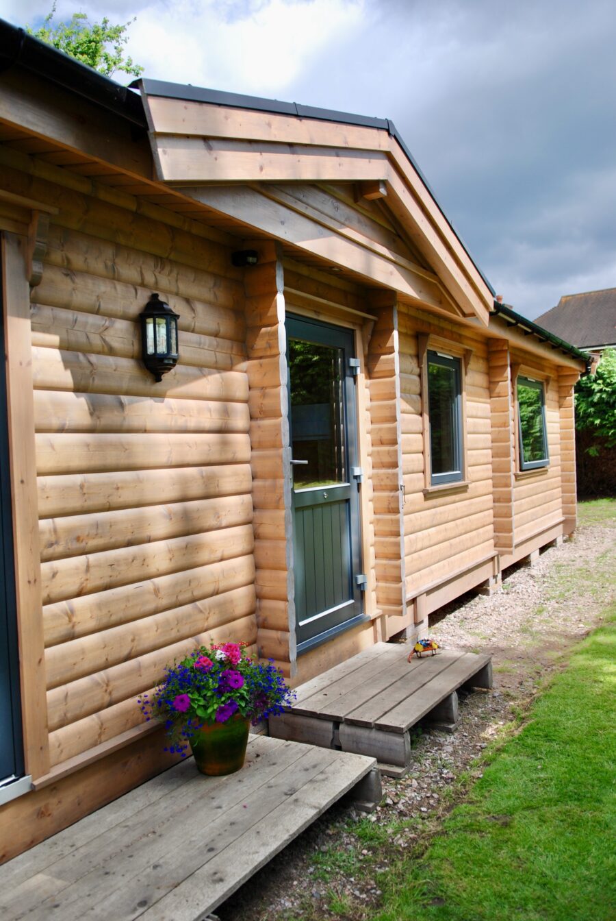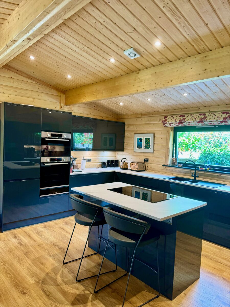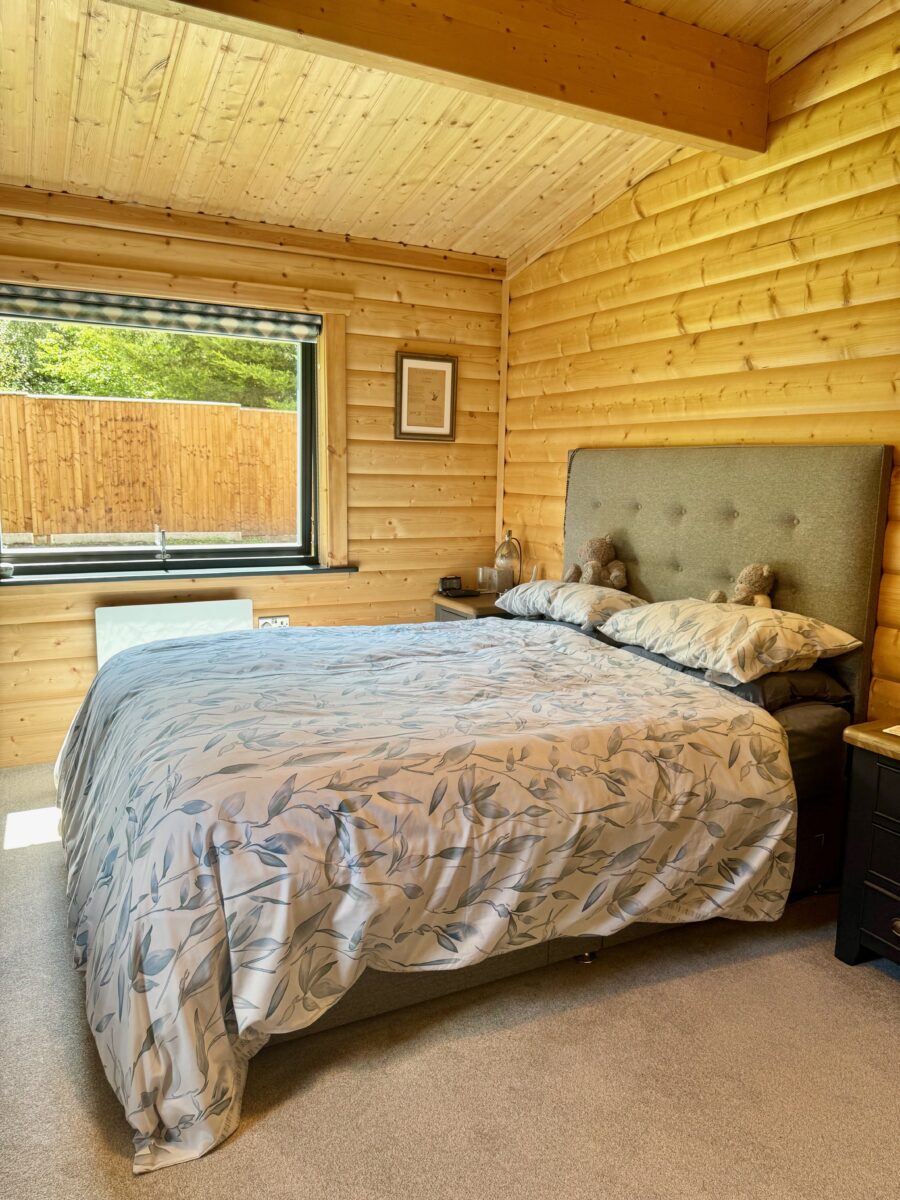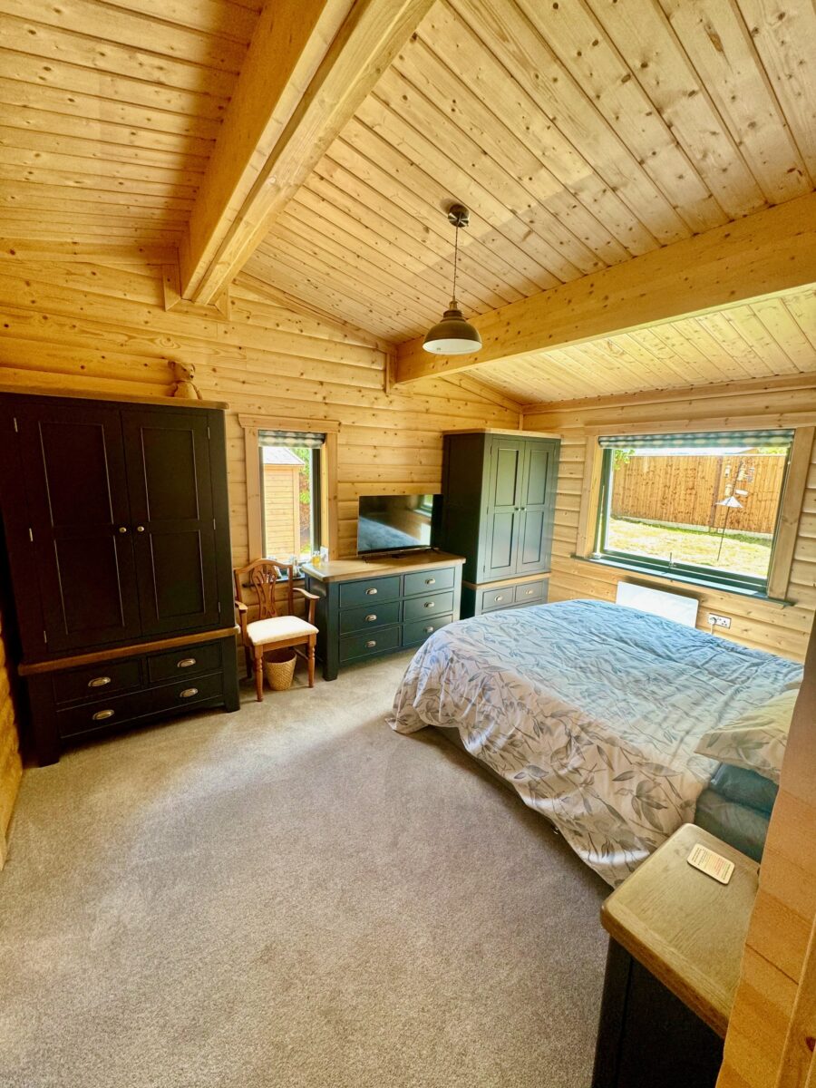 Their cabin is bright, spacious and contemporary. A stunning open plan kitchen and dining area with bifold doors opening onto the garden, leads onto an airy sitting room, again with bifolds plus a stylish wood burner. The large master bedroom has an adjoining bathroom with a luxurious corner bath, and a separate double bedroom sits opposite a family shower room. There is even a handy utility room tucked off the main hallway. With the future in mind, doorways are wide enough for a wheelchair, the shower is accessible, and when external landscaping and decking is completed, an external ramp from the garden will be added.
