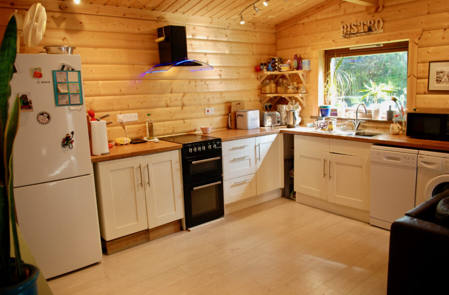 Sally, who has two adult children, has tweaked the interior layout of the stylish new cabin to allow for three double bedrooms, a shower room, an extra loo and a large kitchen/dining and living space. Her new home, finished in a dark exterior hue, sits snuggly in what was her parent’s large, fenced vegetable patch.
