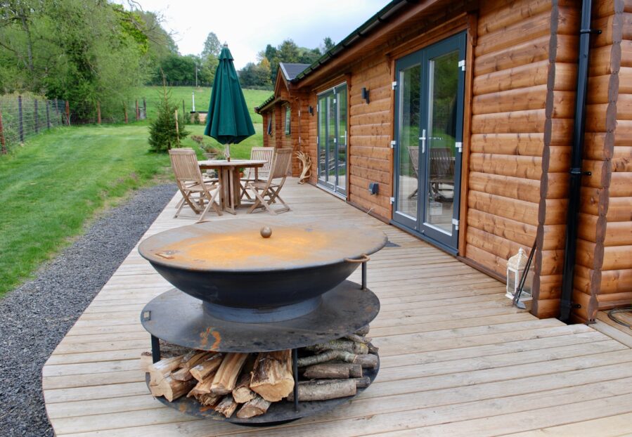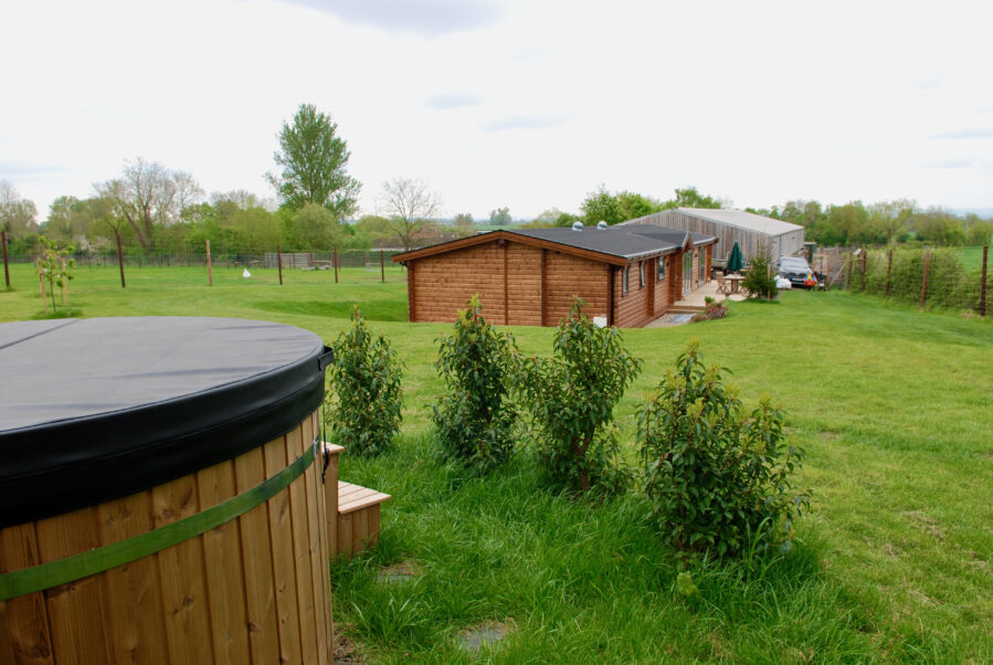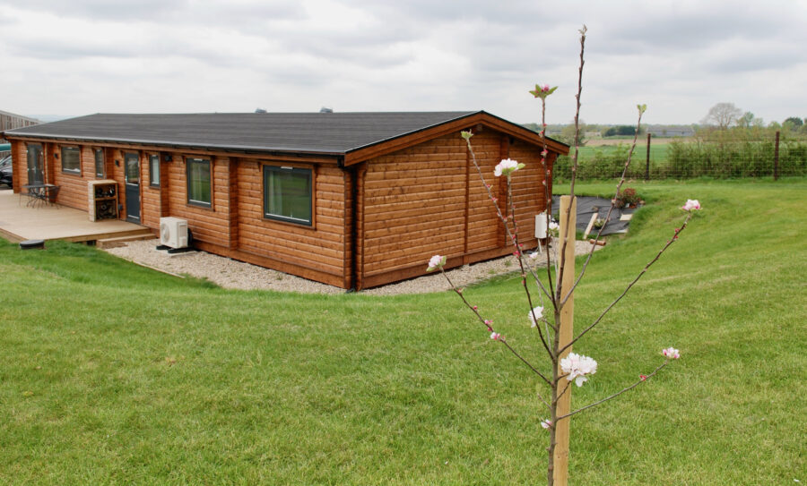The couple feel passionately about their local environment and biodiversity, and their new solid log home is a perfect match. Thoughtfully sited on their land, edged with native hedging, it looks like it has been tucked into the hillside. They have cleverly positioned the lodge for wonderful sunrise and sunset views through large bifold doors in their open plan living, kitchen and dining area. Underfloor heating powered by the cabin’s air source heat pump keeps it cosy. Three bedrooms, a family bathroom, shower room, utility/boot room and farm toilet complete the contemporary set-up. A large decking area with fire pit is the ideal spot for entertaining, and a wood-fired hot tub has views across the fields.